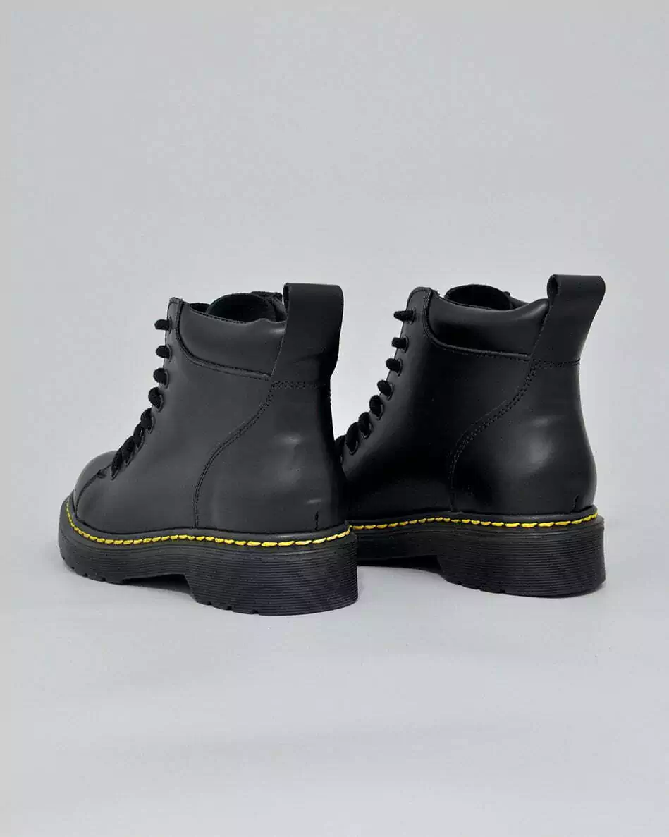 La capellada tiene un diseño con ocho ojales metálicos color negro, detalle de costura de color amarillo en la base y cuello acolchonado forrado en cuero negro.