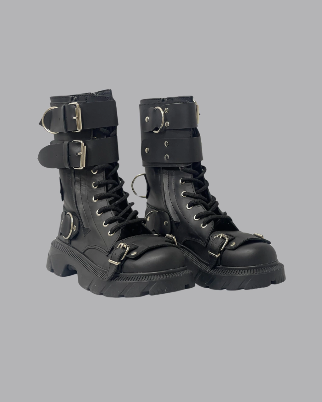 Borcego de caña alta con cordones y base de material TR importado. El diseño cuenta con diez ojales metálicos color nikel a cada lado de la capellada, apliques y hebillas metálicas. Cuenta con un cierre lateral interno y externo.